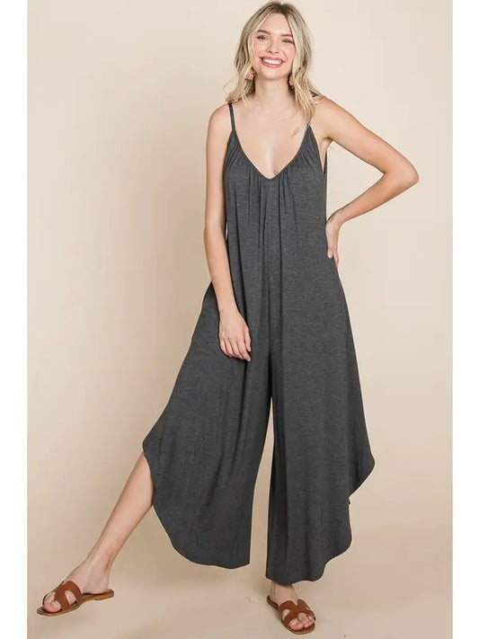 Solid Spaghetti Strap Jumper with Asymmetrical Hem and Cuffed Pockets